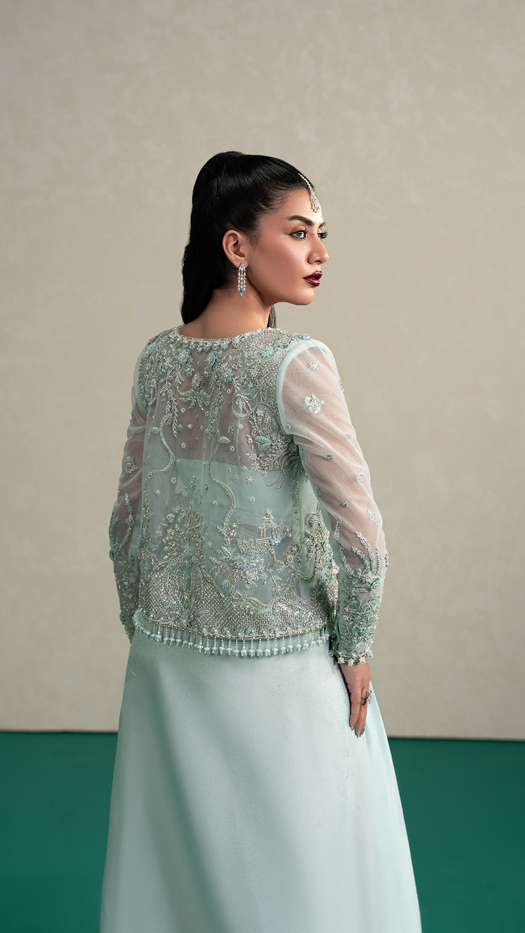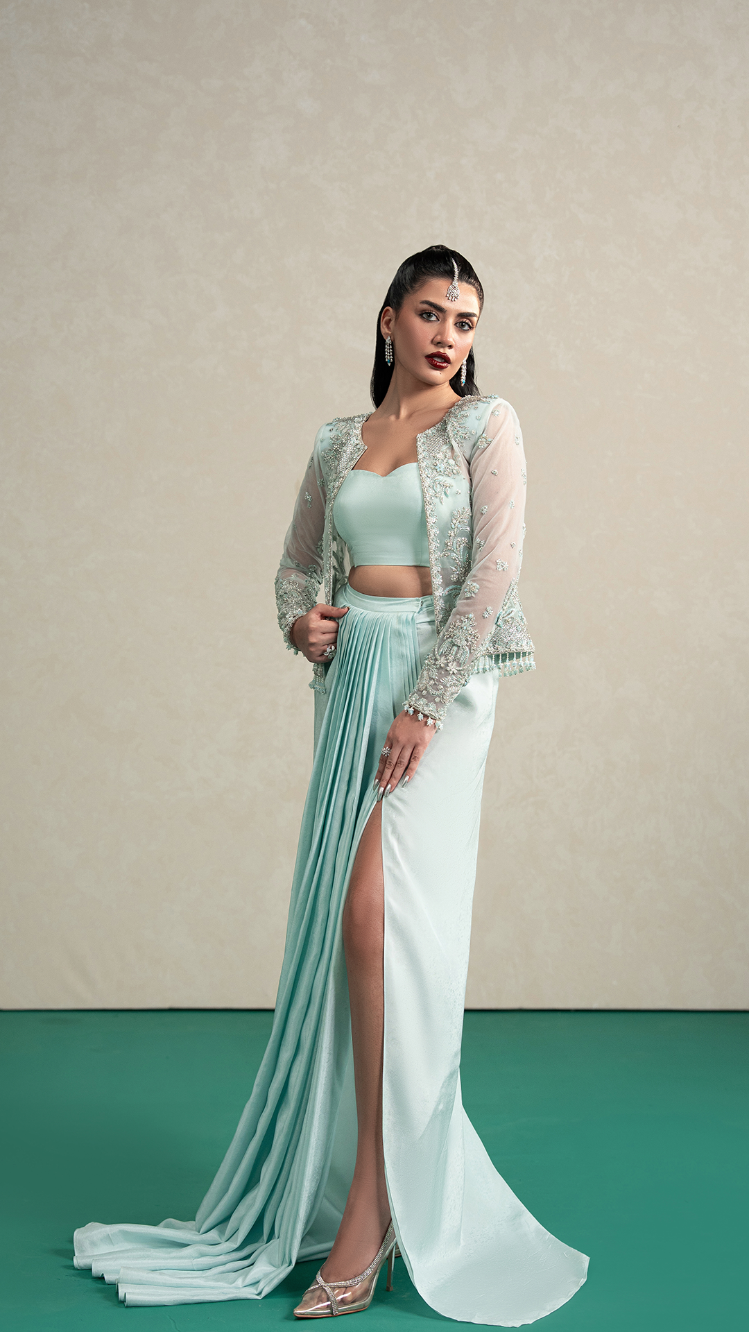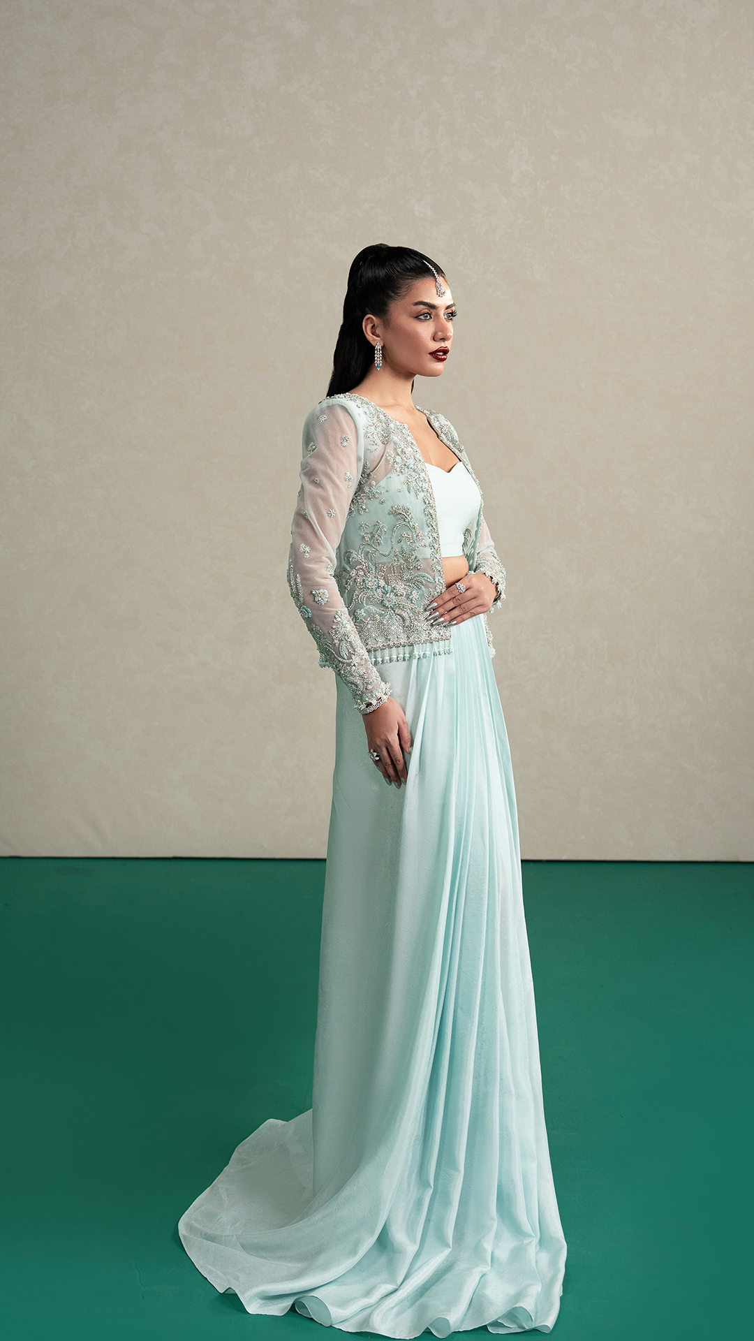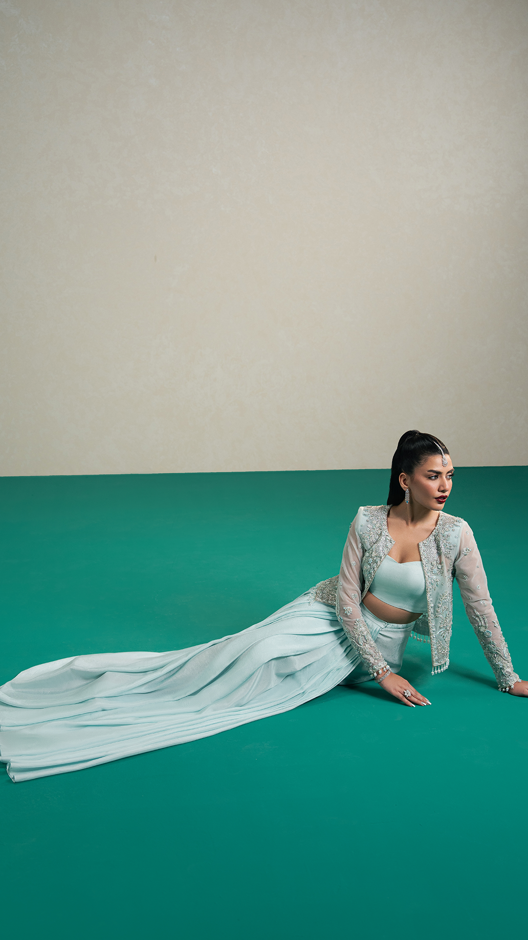An ice-blue vision of celestial elegance, features a structured embossed silk tube top paired with a delicate, hand-embroidered silk net jacket. The jacket shimmers with beadwork, 3D florals, pearls, resham, cutdana and crystals, while a pre-draped silk waterfall skirt flows gracefully, balancing structure with a sense of fluidity.