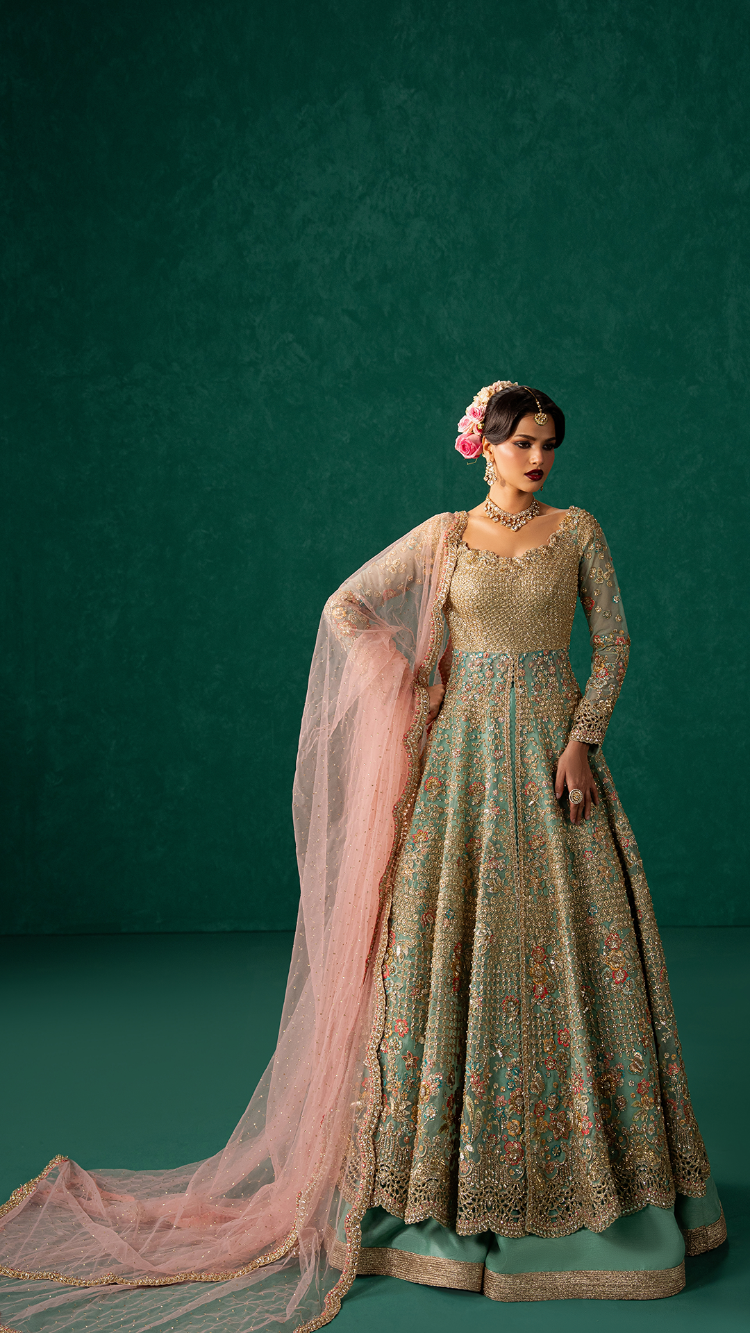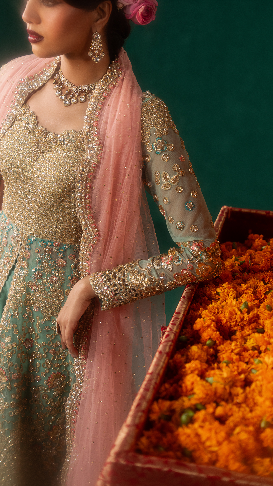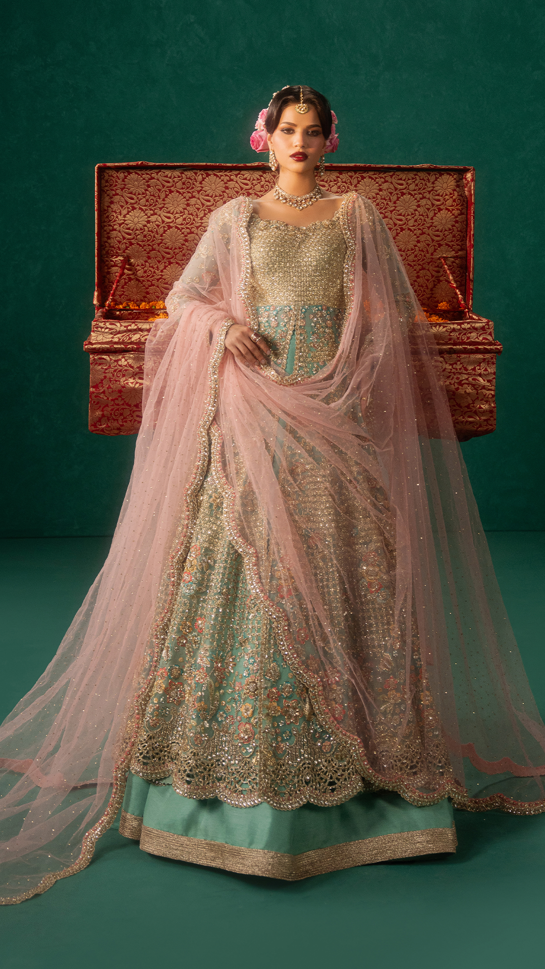 DupattaGul is an exquisite sea-green, front-open peshwas, showcasing a gold-embellished bodice and panels enriched with zardozi, cutdana, betki, mukesh, nakshi, sequins, and gota. Accented with mustard, peach, salmon pink, and teal, its floral trellis motif rests on a delicate honeycomb backdrop, creating an enchanting aura. It is layered with a flared Korean raw silk lehnga with gold dabka detailing. The look is completed with blush pink tulle dupatta with scalloped, hand-embellished crystals border and sequins spray throughout. Overall, this garment seamlessly blends artistry and opulence, making it a truly captivating piece for a wedding occasion.