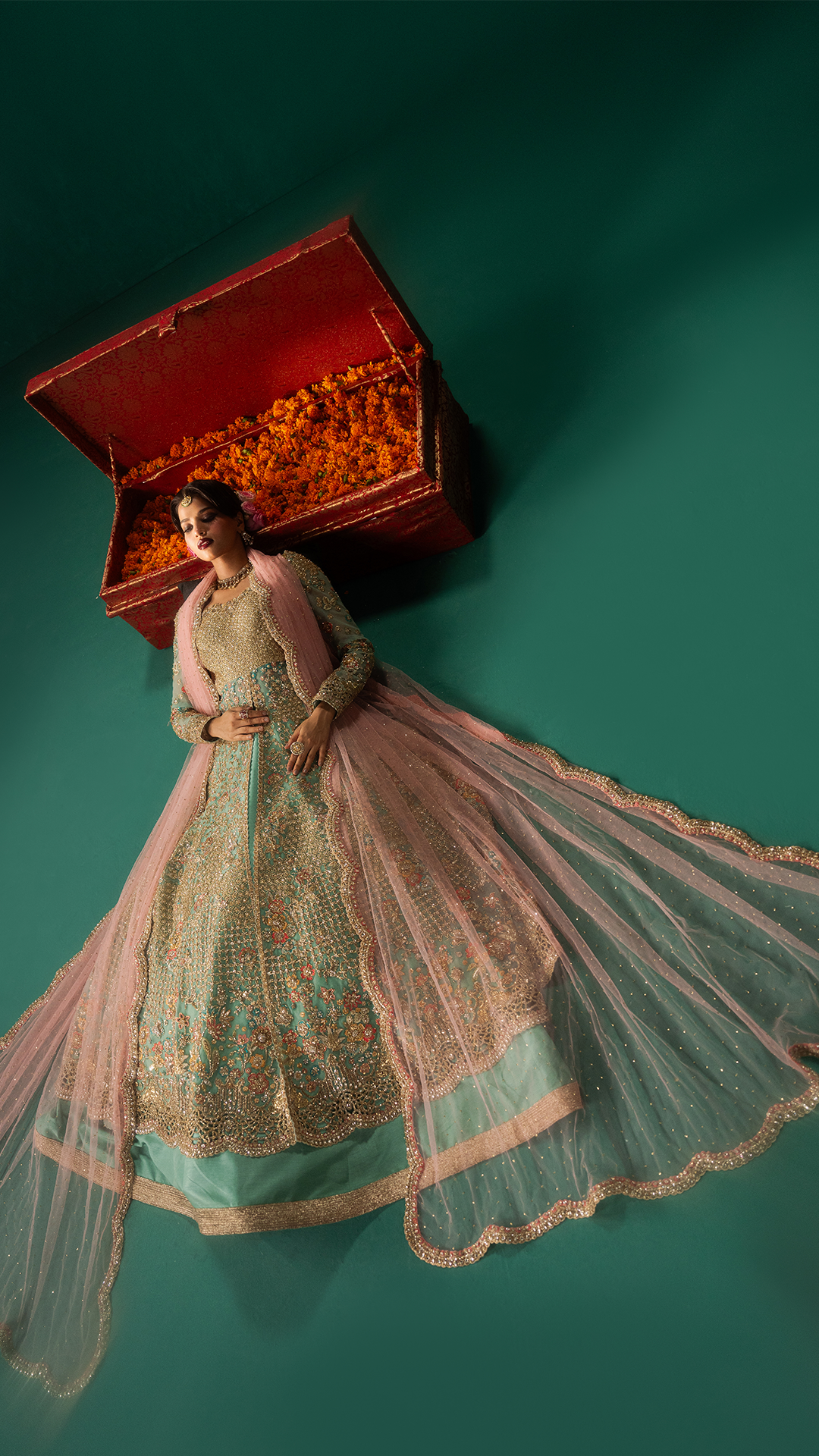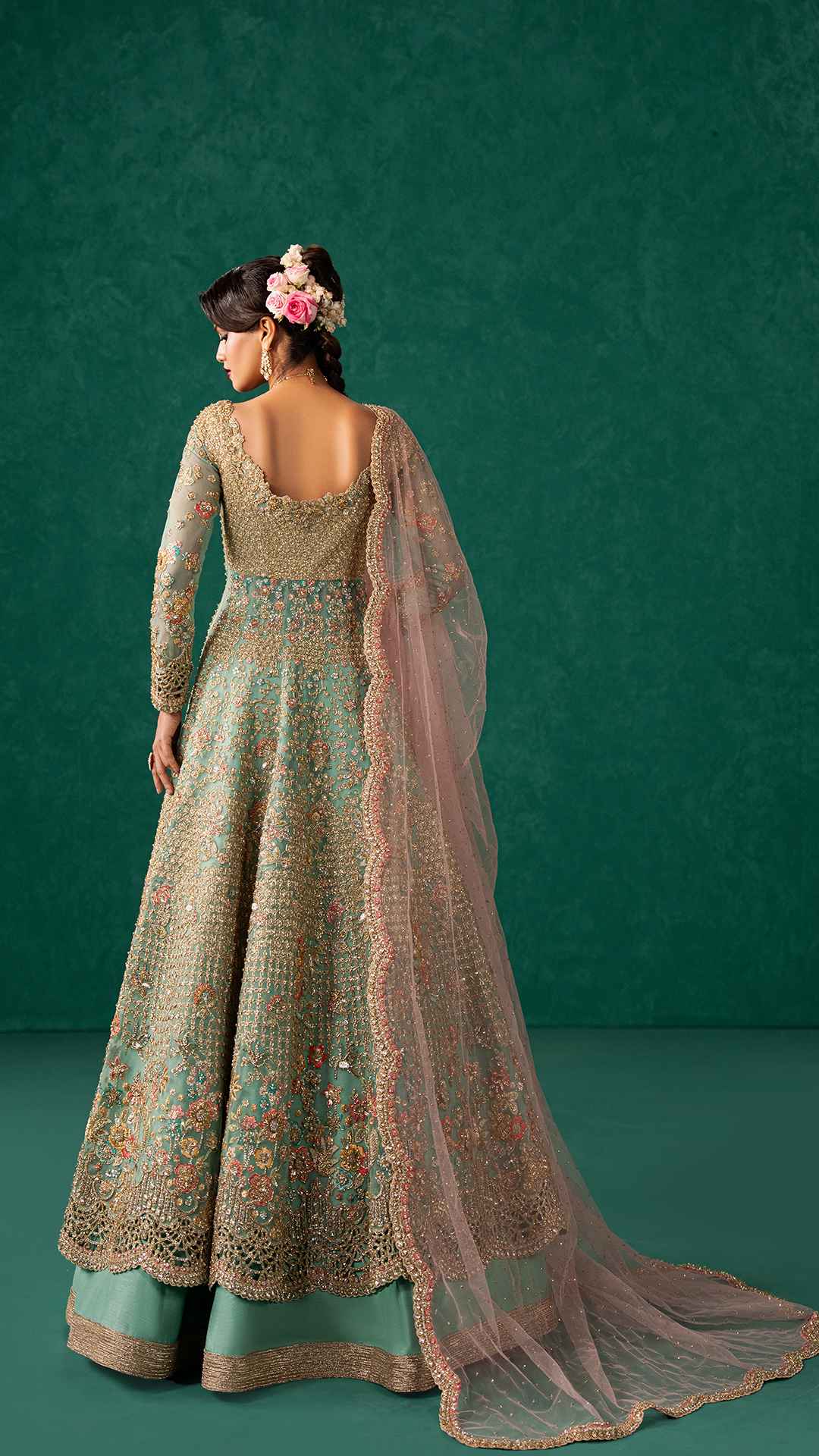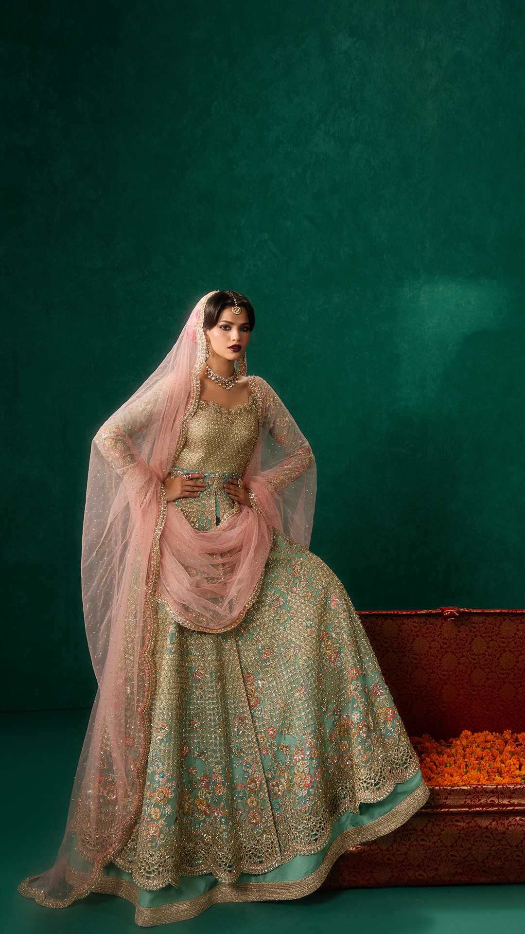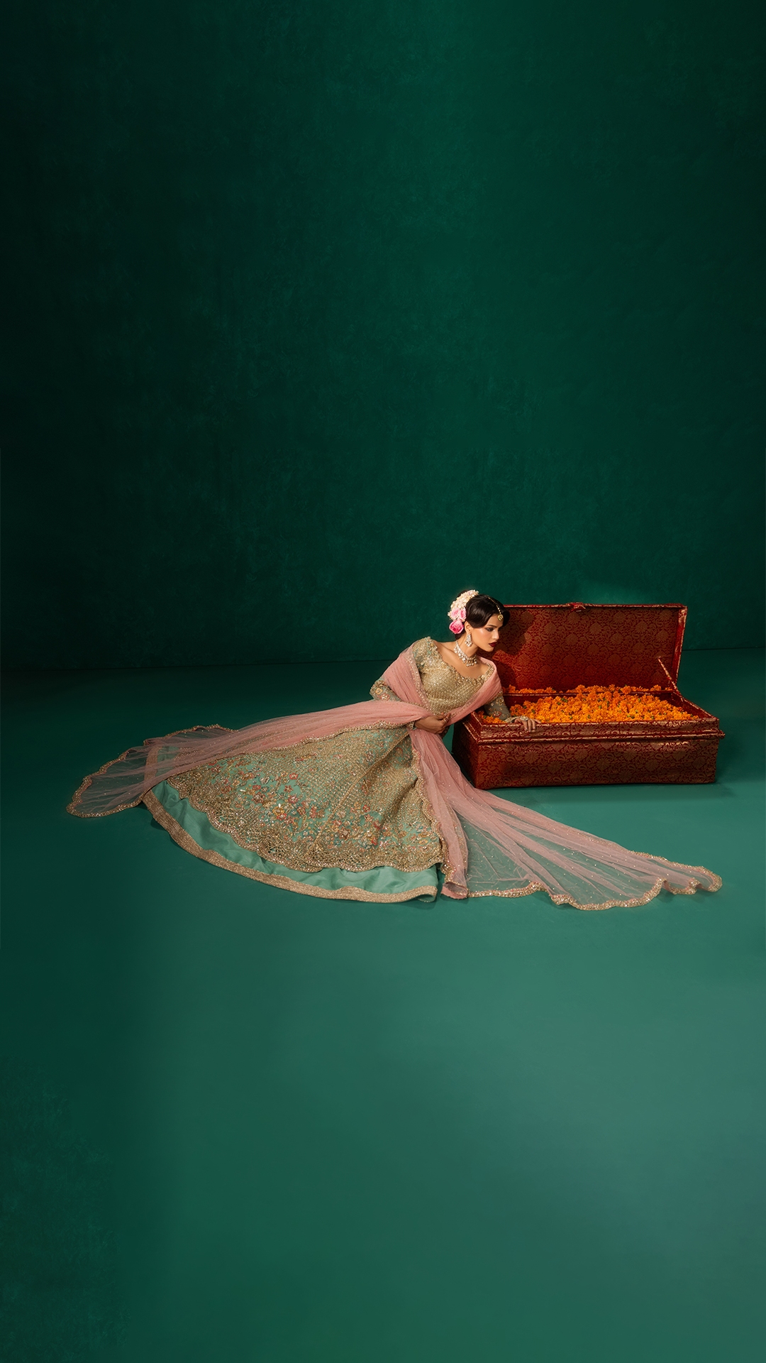 DupattaGul is an exquisite sea-green, front-open peshwas, showcasing a gold-embellished bodice and panels enriched with zardozi, cutdana, betki, mukesh, nakshi, sequins, and gota. Accented with mustard, peach, salmon pink, and teal, its floral trellis motif rests on a delicate honeycomb backdrop, creating an enchanting aura. It is layered with a flared Korean raw silk lehnga with gold dabka detailing. The look is completed with blush pink tulle dupatta with scalloped, hand-embellished crystals border and sequins spray throughout. Overall, this garment seamlessly blends artistry and opulence, making it a truly captivating piece for a wedding occasion.