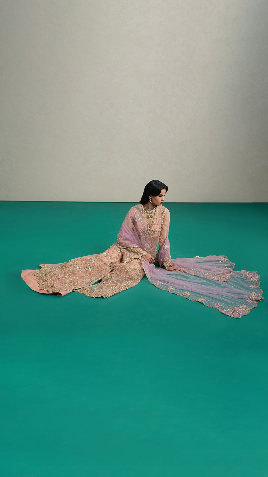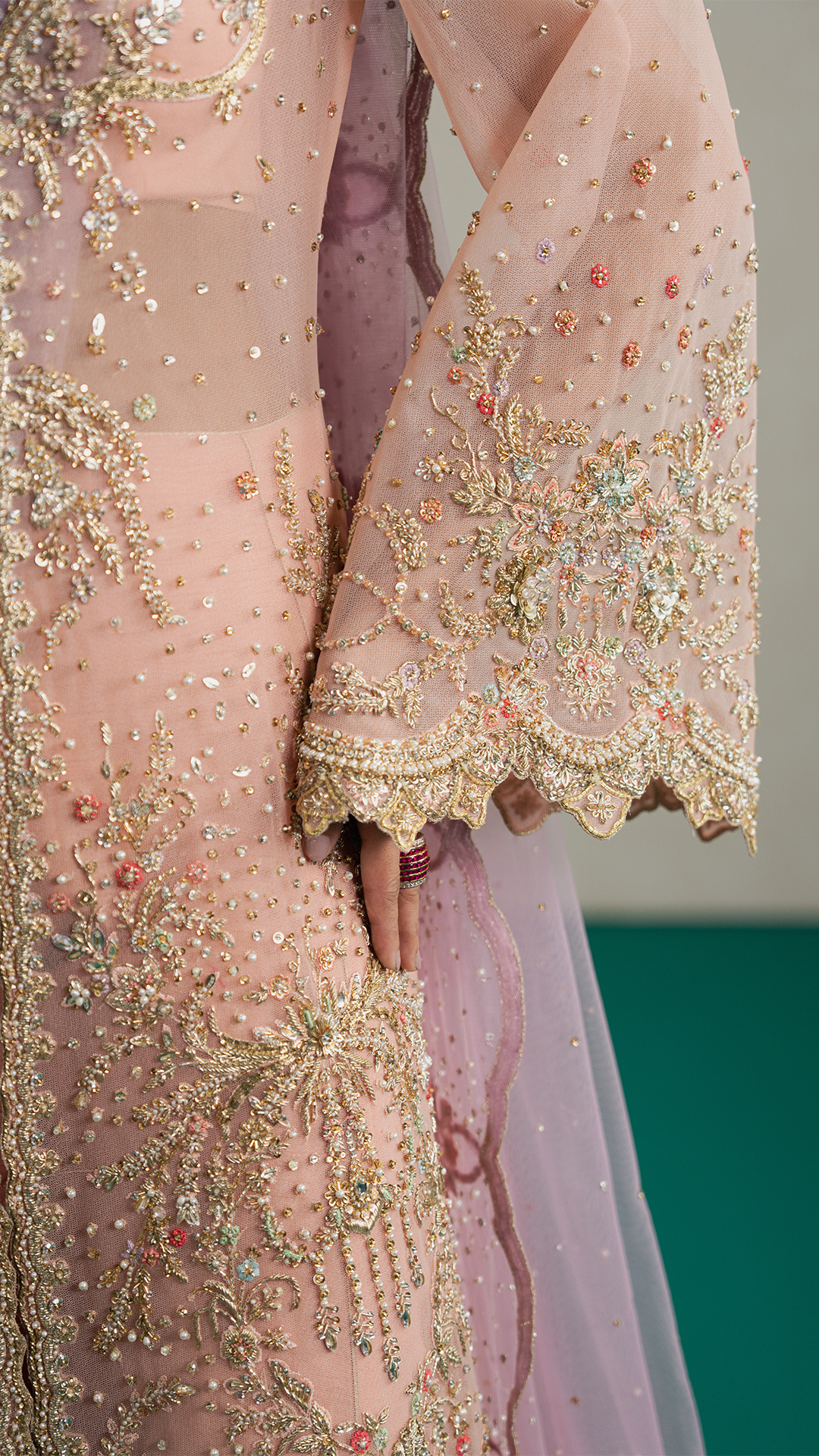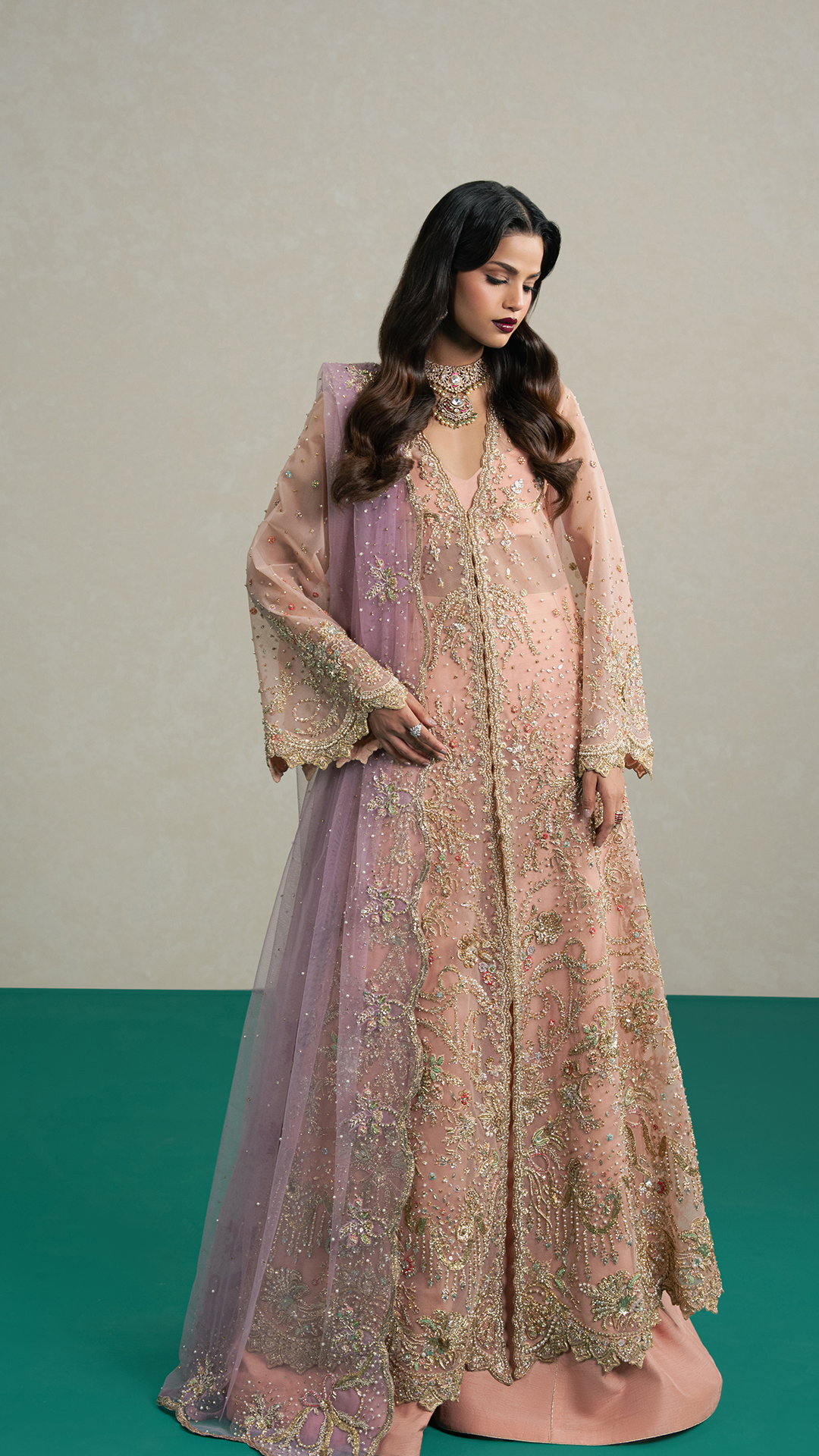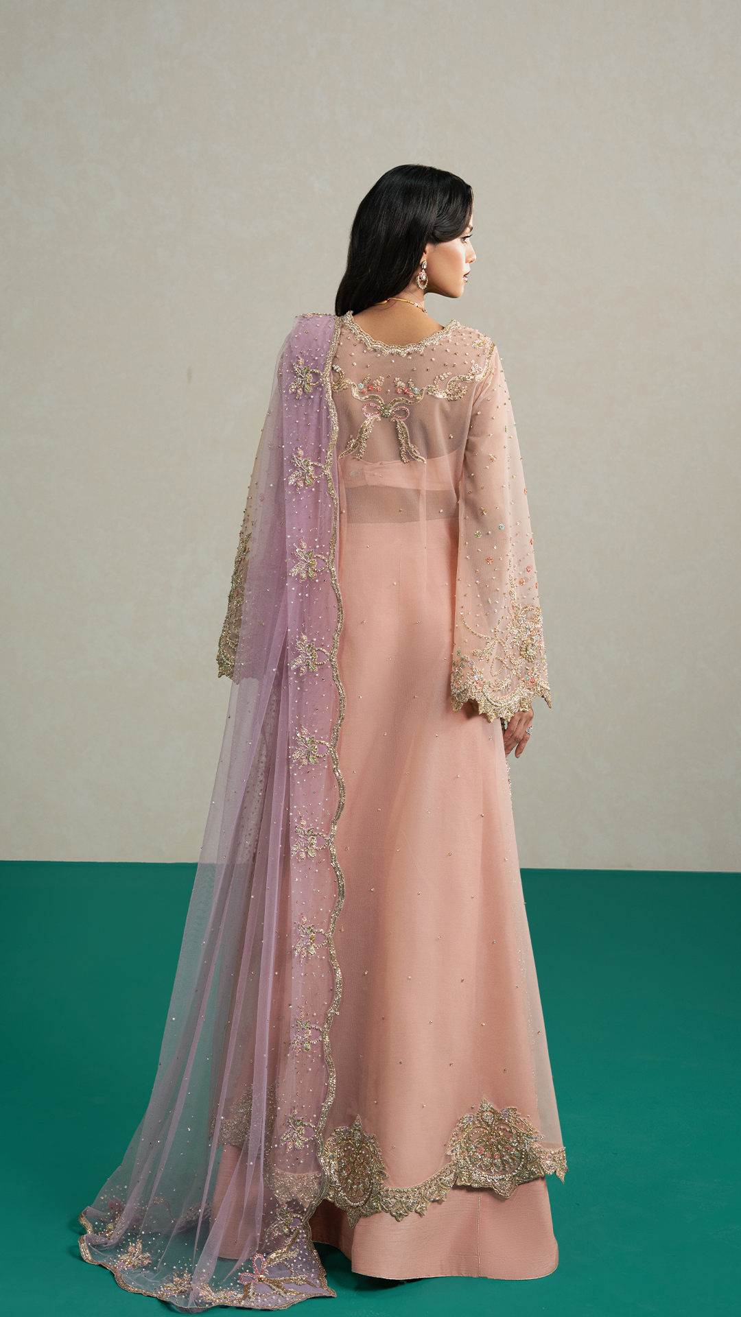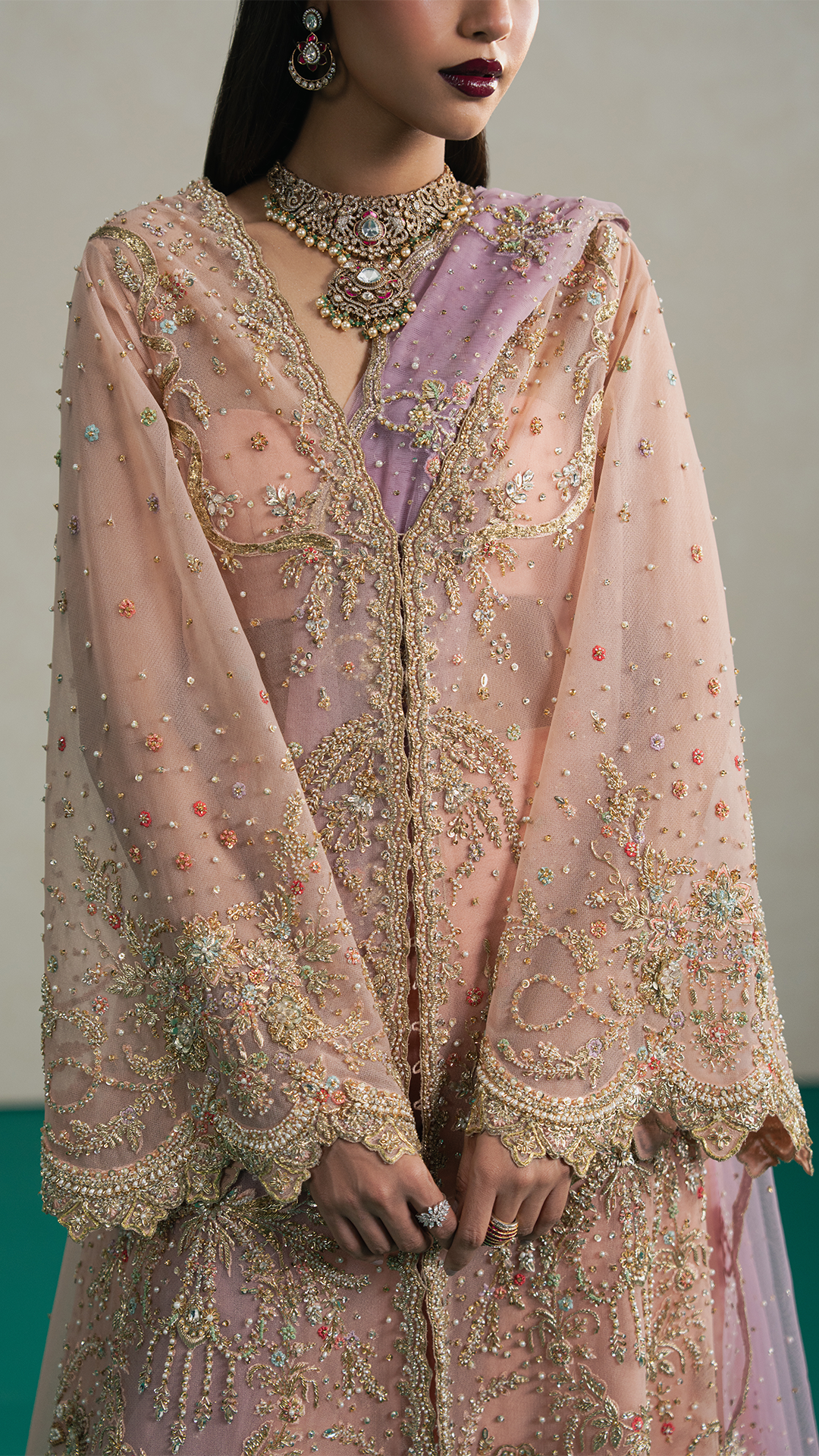 BottomEnveloped in a dreamy peach hue, this front-open flared shirt exudes elegance and charm. Intricately adorned with delicate hand embroidery, pita work, Japanese cutdana, crystals, pearls and timeless zardozi, it sparkles with accents of blue, lilac, sage green, and coral pink, creating a symphony of subtle colors. Paired with a sumptuous raw silk azaar and a soft lavender net dupatta, delicately bordered with swirling hand embroidery and shimmering sequins, the ensemble radiates ethereal grandeur; perfect for the modern woman with a refined sense of sophistication.