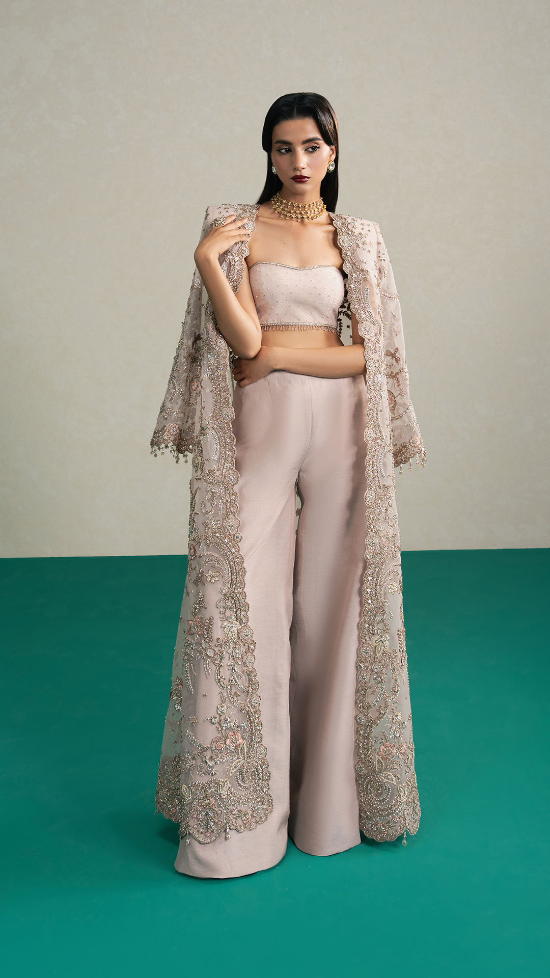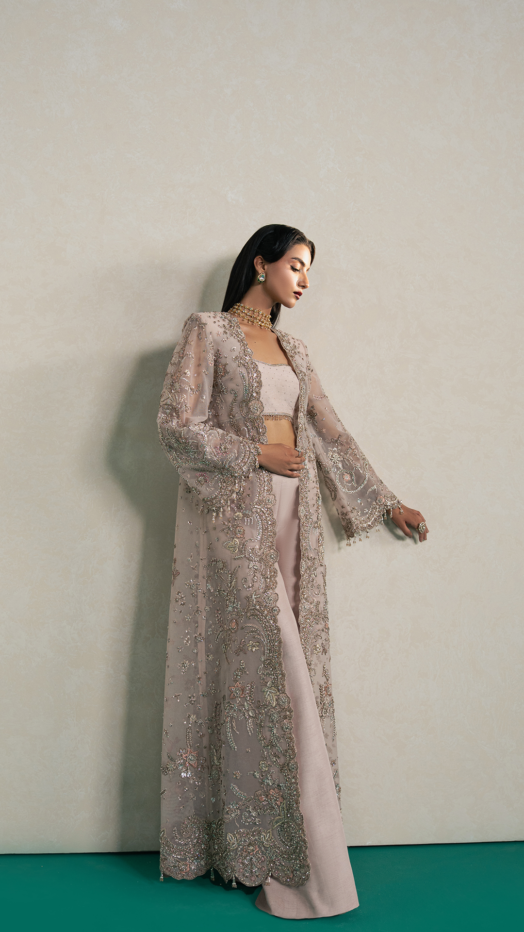 This stunning champagne, long-length net jacket is adorned with a rich tapestry of mukesh, nakshi, cutdana, crystal drops, sequins, and 3D handcrafted florals, showcasing the finesse of timeless craftsmanship. Worn atop an embellished raw silk blouse and paired with a Korean raw silk azaar, it is surely a showstopper for any festive occasion.