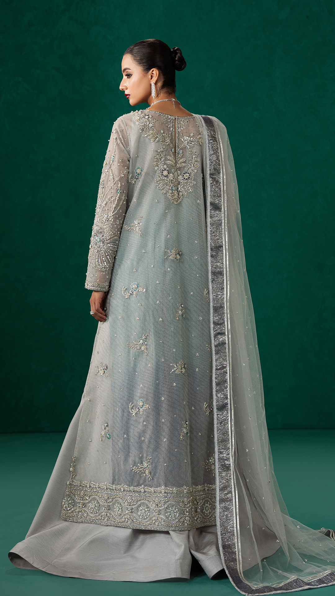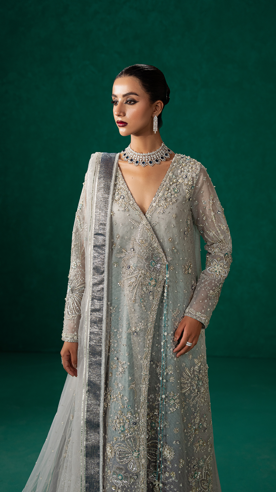BottomThis starlight grey angrakha radiates contemporary charm, embellished with dazzling linear and jewelled handwork. Navy blue and teal resham florals bloom amid mukesh, sequins, betki, Japanese cutdana, 3D florals and pearls, adding depth and elegance. Paired with a panelled raw silk sharara and a cascading tulle dupatta edged with shimmer lamé borders, it strikes the perfect balance between modern sophistication and timeless craftsmanship.